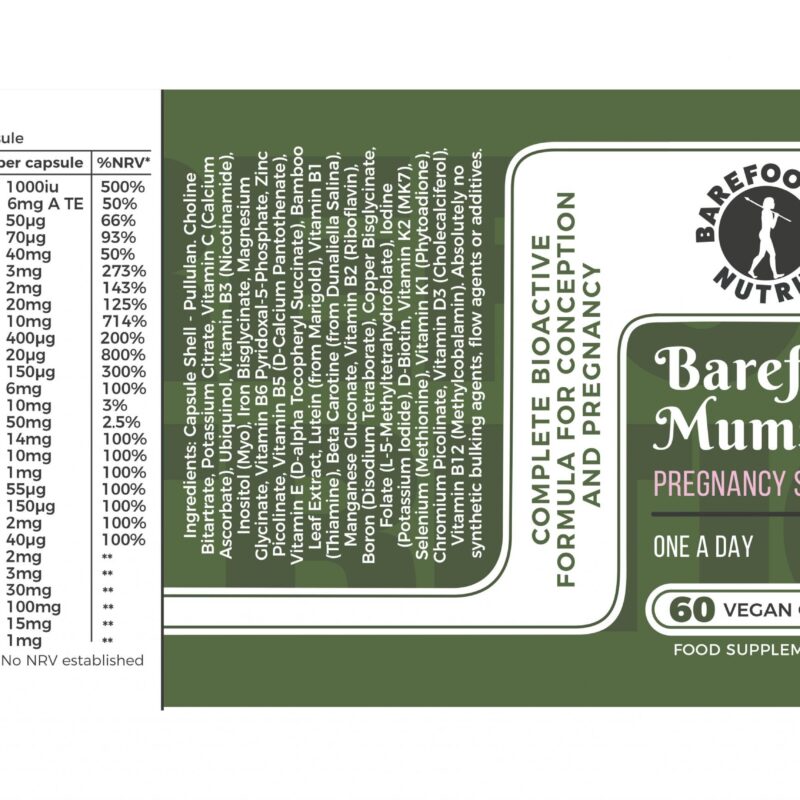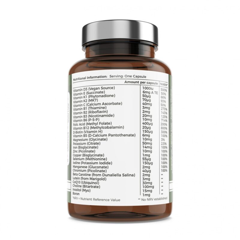 Ingredients: Capsule shell: Pullulan, Choline bitartrate, Potassium Citrate, Vitamin C (Calcium Ascorbate), Ubiquinol, Vitamin B3 (Nicotinamide), Inositol (Myo), Iron bisglycinate, Magnesium Glycinate, Vitamin B6 (Pyridoxal-5-phosphate), Zinc picolinate, Vitamin B5 (D-Calcium Pantothenate), Vitamin E (D-Alpha Tocopherol Succinate), Bamboo leaf extract, Lutein (from marigold), Vitamin B1 (Thiamine), Beta carotene (from Dunaliella Salina), Manganese Gluconate, Vitamin B2 (Riboflavin), Boron (Disodium tetraborate), Copper bisglycinate, Folate (L-5-Methyltetrahydrofolate), Iodine (Potassium iodide), D-Biotin, Vitamin K2 (MK-7), Selenium (methionine), Vitamin K1 (phytoadione), Chromium Picolinate, Vitamin D3 (vegan source cholecalciferol), Vitamin B12 (Methylcobalamin).