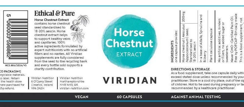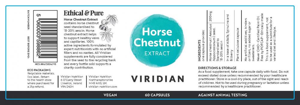 Ingredients: Horse Chestnut seed extract (18-20% aescin), Horse Chestnut seed powder, in a base of alfalfa, spirulina and bilberry, plant cellulose capsule.