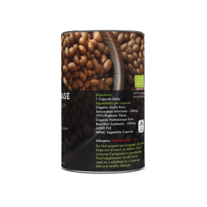 Ingredients: Organic Inulin from Jerusalem Artichoke, Organic Nattokinase from Brazilian Soybeans, HPMC Vegetable Capsule.